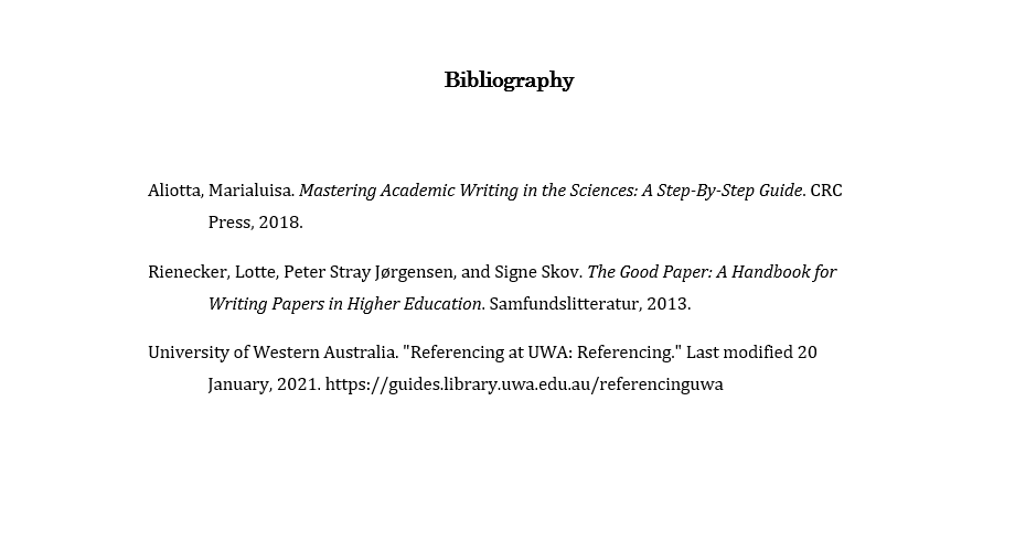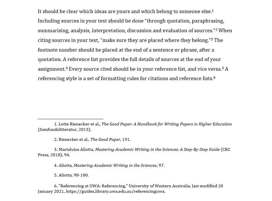 This example text shows where to position superscript numbers citations within the text, the details in the associated footnotes at the bottom of the page, and Bibliography located at the bottom of the document.