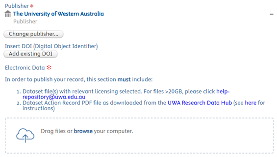 - Publisher is set to UWA by default, but you can change it to a different publisher if your dataset sits in a different repository.